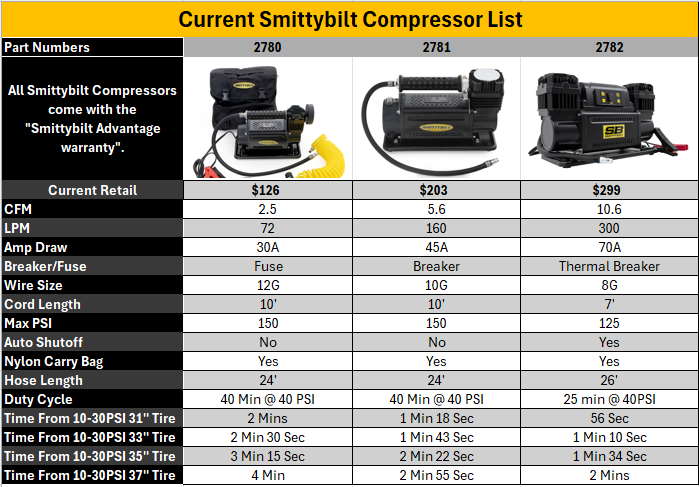 Need help choosing the right fit? Our Compressor Comparison Chart and Tire Size Air-Up Guide make it easy to see which model fits your setup and style. No matter which you choose, every Smittybilt compressor is backed by the Smittybilt Advantage Warranty and comes ready to roll—with an air hose, gauge, fittings, and carry bag included.