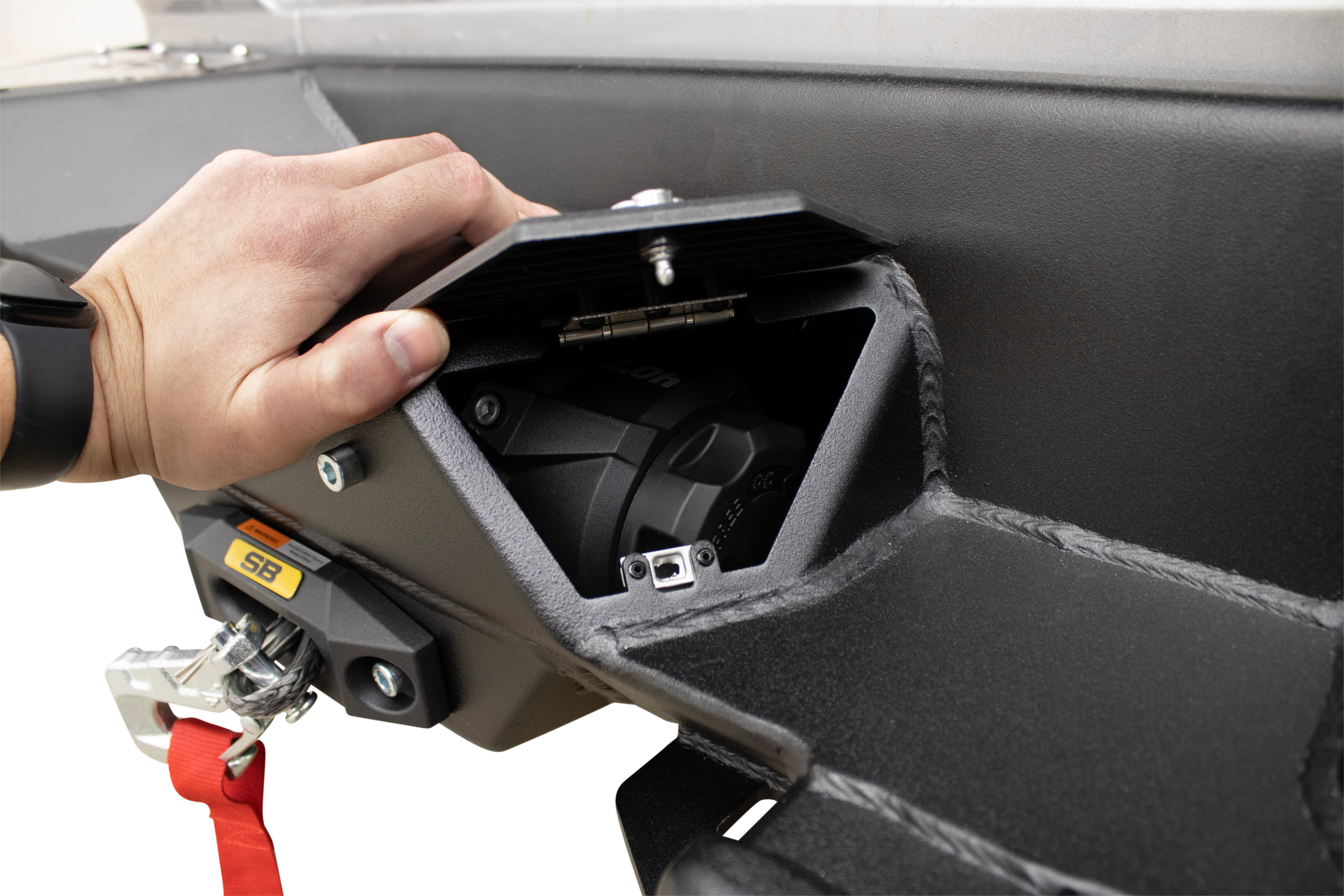 Constructed from 3/16″ cold-rolled steel and finished with a durable two-stage textured matte black powder coat, it provides exceptional impact resistance and corrosion protection. Raised corners improve departure angles for tackling steep obstacles, while integrated recovery features and winch compatibility make it a true off-road workhorse.